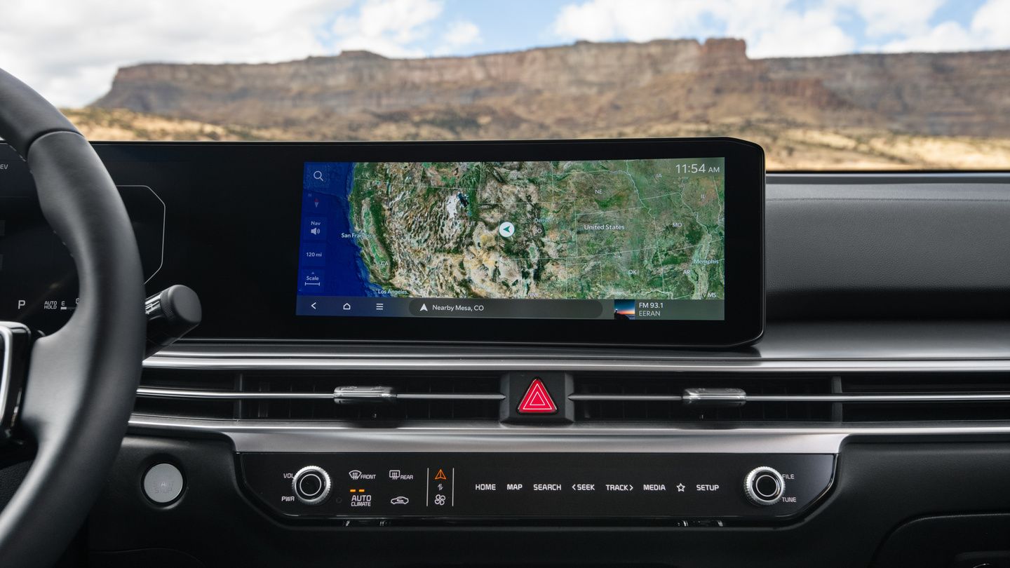 The Sorento HEV's technology stack scales across three trims. The LX includes a 4-inch TFT instrument cluster and 6-speaker audio, while the EX adds wireless phone charging, HomeLink, and a smart power liftgate. The SX brings the full suite:
